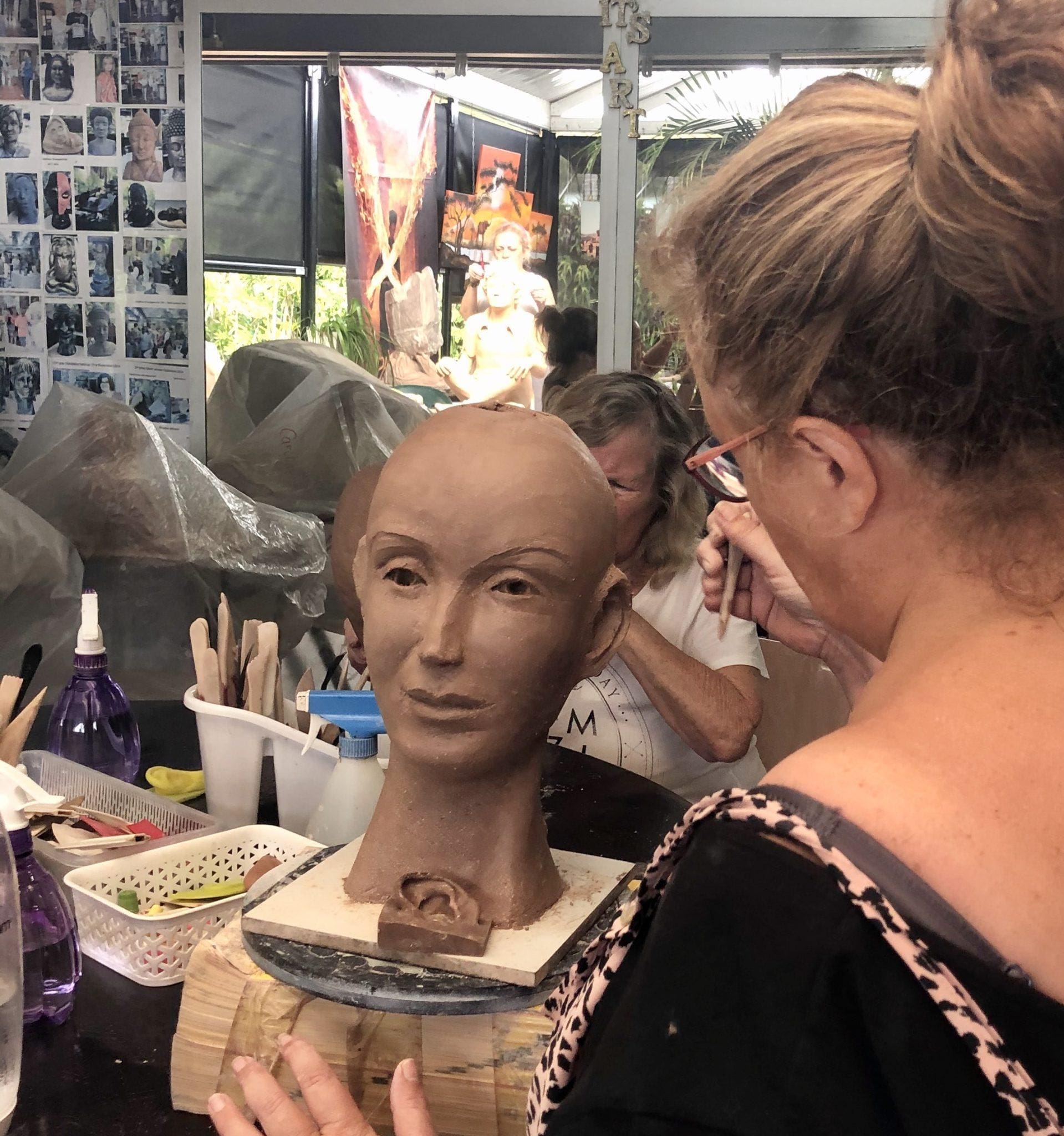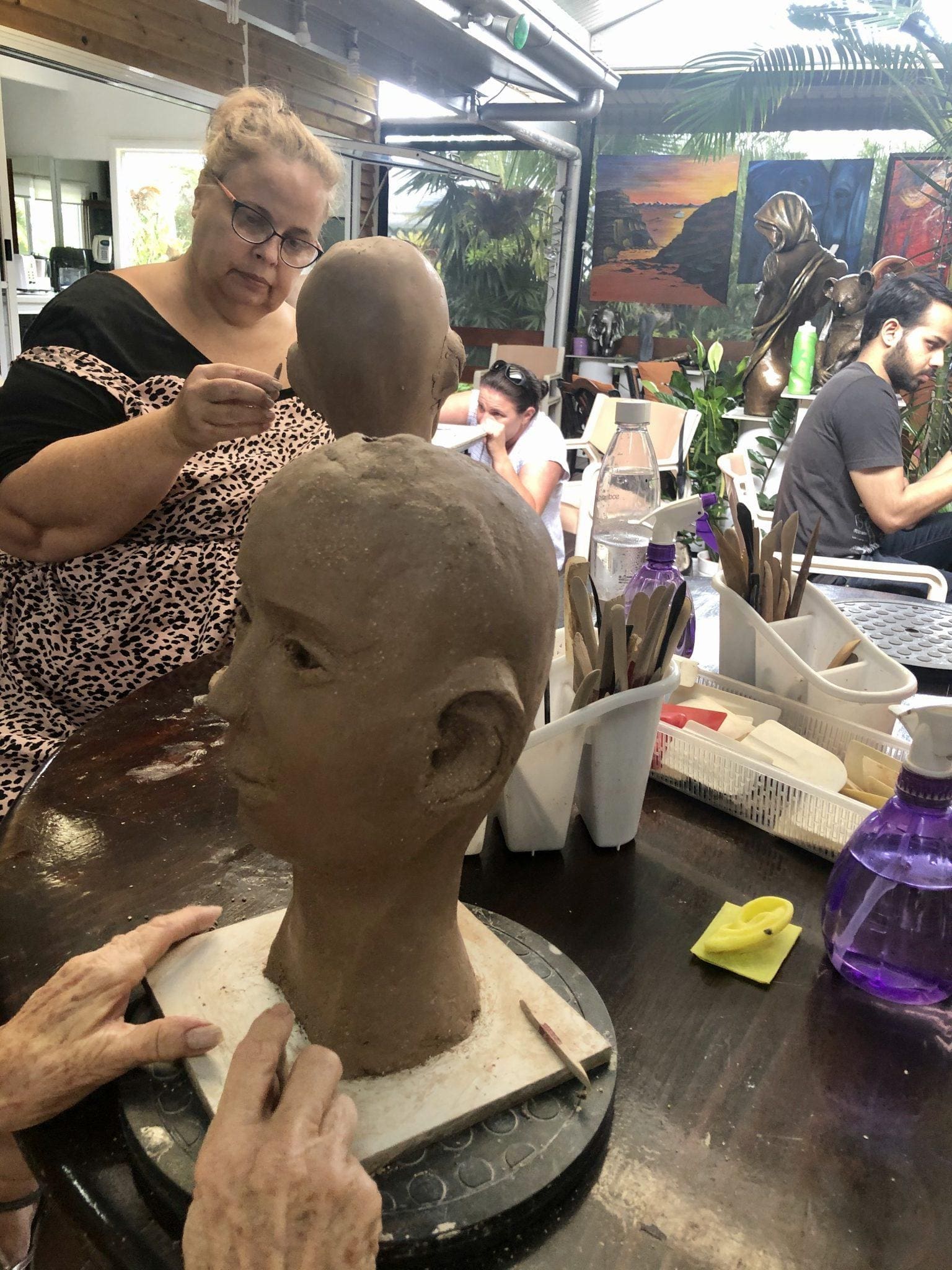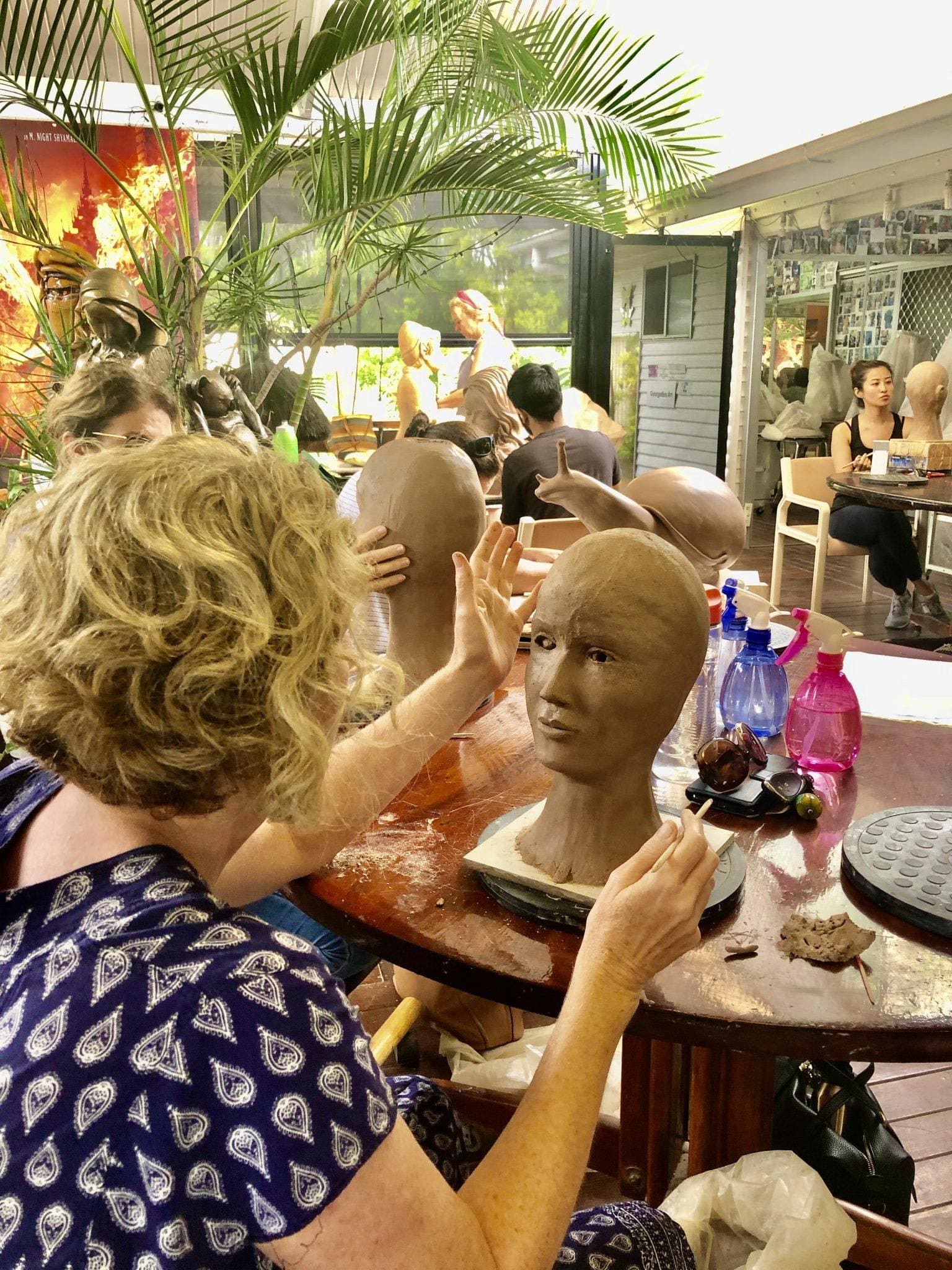 Beginners sculpting a head in clay, some have added the eyes, nose and mouth and others have progressed to adding the ears. The next stage is in adding hair or scarf as in a turban, some have added hats. so it will be interesting to see what each one chooses. Let’s remember that laughter increases our immune system while stress depletes it. so come on over for some art therapy. Georgette 0403 128 380