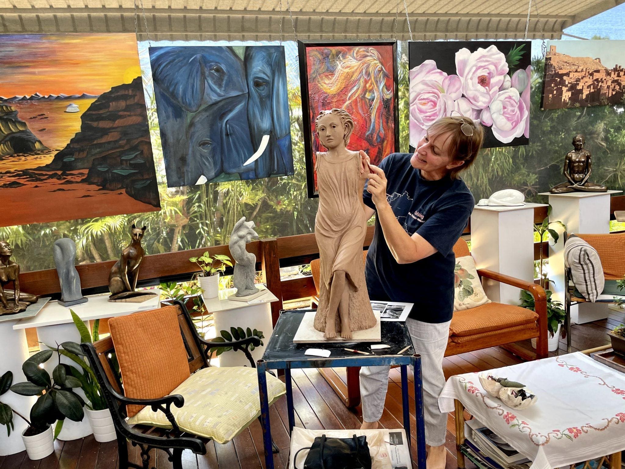 Hazel is a very accomplished sculptor and while travelling overseas a sculpture caught her eye. On returning home, she kept thinking about this particular sculpture. Hazel has now decided to replicate it. Working from the photographs that were taken while overseas she is succeeding in its duplicate. She has captured the face beautifully and also the drape of the outfit. Hazel now feel she would like to make it her original clay sculpture and is altering it to her liking.